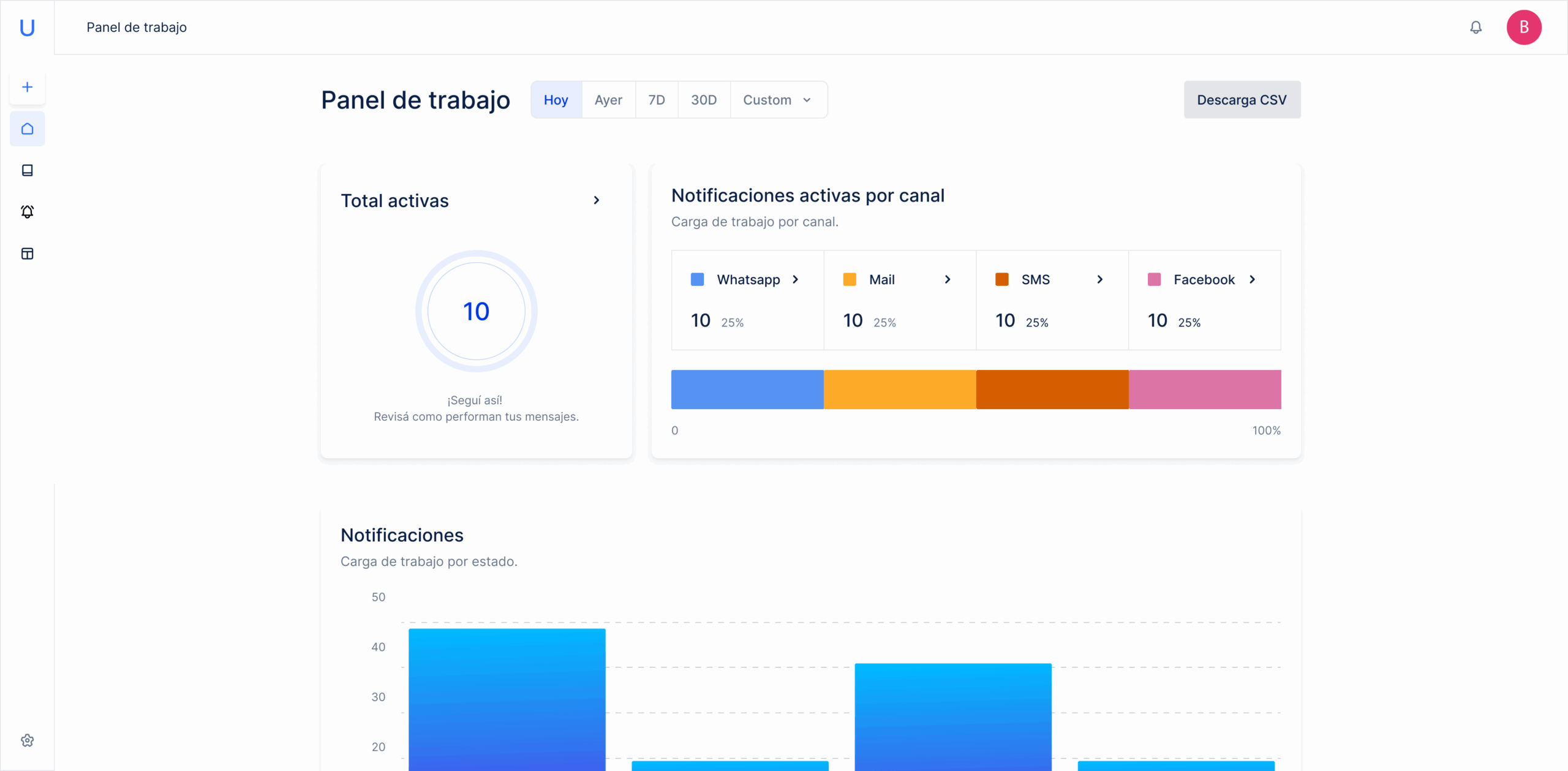 Notification Center centraliza los canales de comunicación: mail, WhatsApp, notificaciones push, SMS y llamadas automatizadas, en una única interfaz. Desde allí, los equipos pueden crear campañas, configurar reglas de envío y monitorear resultados en tiempo real, sin depender de múltiples herramientas o integraciones manuales.